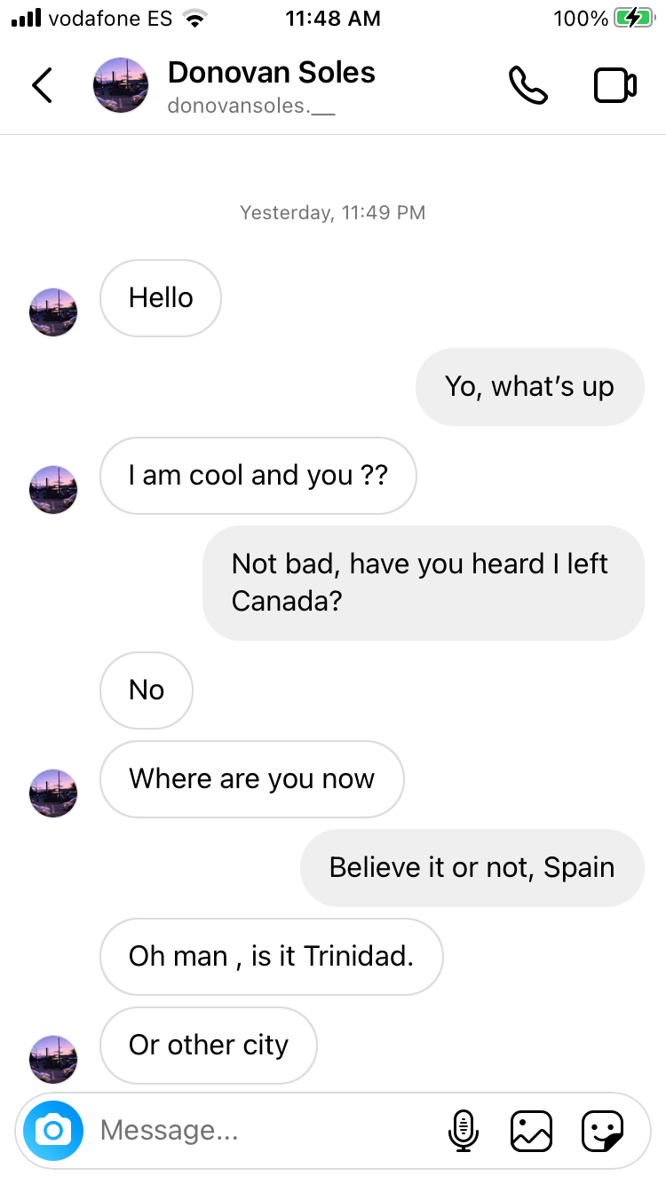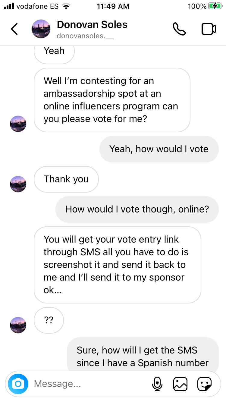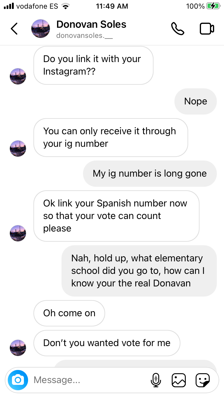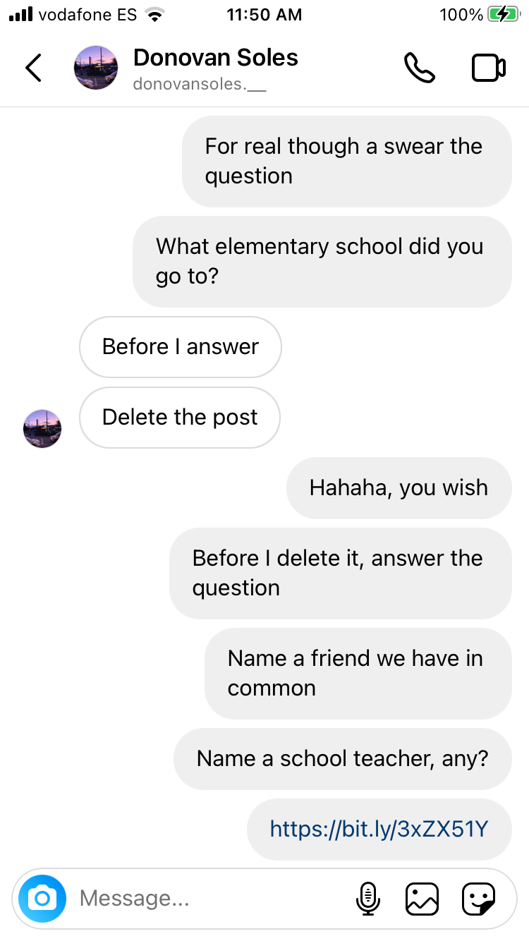 The account @donovansoles.__ on instagram has been hacked. The original account, @donovan2431, is unresponsive. As you can see in the images below, the hacker refused to answear simple questions such as, what elementary school he went to, I also spelled his name wrong and he didn't seam to notice. The hack works due to instagrams recovery system, he requests a link from instagram to recover an account and he asks you for the link which he then uses to get into your account, once inside, he resets your password and changes your phone number so you, yourself, cannot recover it.